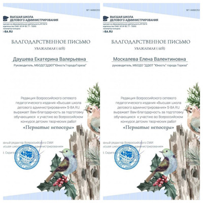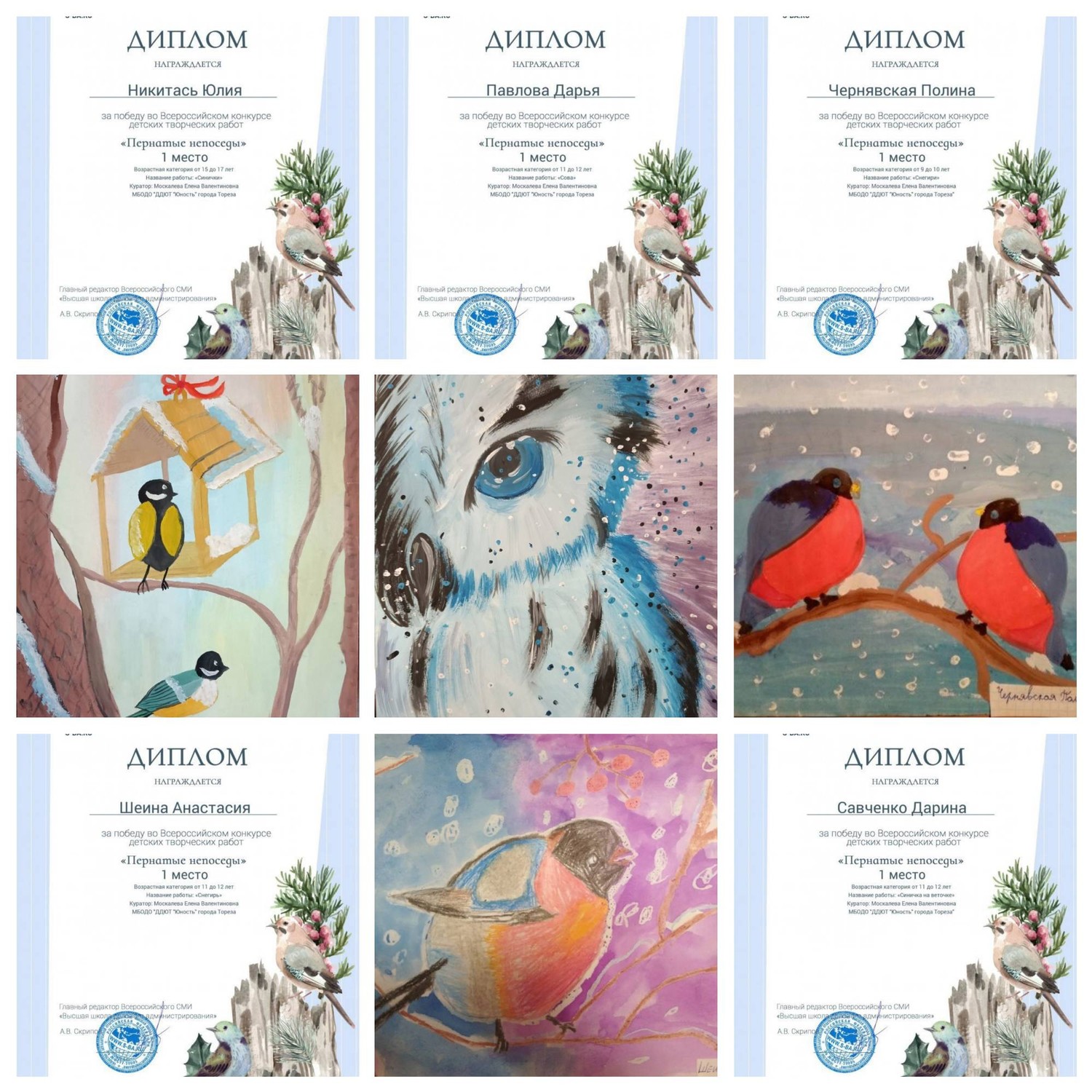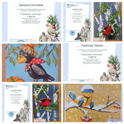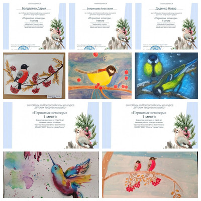 12 ноября в России отмечают экологический праздник – Синичкин день. Он создан по инициативе Союза охраны птиц России. В этот день жители разных населённых пунктов страны готовятся к встрече "зимних гостей" из леса – птиц, остающихся на зимовку в российских регионах: синиц, щеглов, снегирей, соек, чечёток, свиристелей. Люди развешивают кормушки, заготавливают для птиц подкормку. С 11 по 16 ноября обучающиеся ТО «Школа красоты» и «Живопись и графика» приняли участие во Всероссийском конкурсе детских творческих работ «Пернатые непоседы» от Высшей школы делового администрирования. Основные задачи Конкурса: • Всестороннее содействие развитию детского творчества; • Поддержка и развитие экологического просвещения и воспитания участников. Итоги конкурса – 14 первых и 7 вторых мест! Образцовый художественный коллектив «Школа красоты» (педагог Москалева Е.В.) – 10 первых и 2 вторых места: 1-е места – Чернявская Полина, Диденко Назар, Иким Виктория, Шеина Анастасия, Савченко Дарина, Павлова Дарья, Карпенко Анна, Болдарева Дарья, Бояринцева Анастасия, Никитась Юлия, 2-е места – Шукурова Нурай и Шукурова Айсу. $IMAGE13 Народный художественный коллектив «Живопись и графика» (педагог Даушева Е.В.) – 4 первых и 5 вторых мест: 1-е места – Терихова Таисия, Фетхуллин Дамир, Галич Данил, Баланюк Ангелина, 2-е места – Клыпа София, Иванов Дмитрий, Гафаров Семур, Гафаров Самир, Коваленко Альбина. Педагоги награждены благодарственными письмами. Поздравляем с отличными результатами и желаем дальнейшего творчества! | |