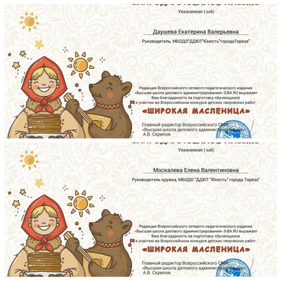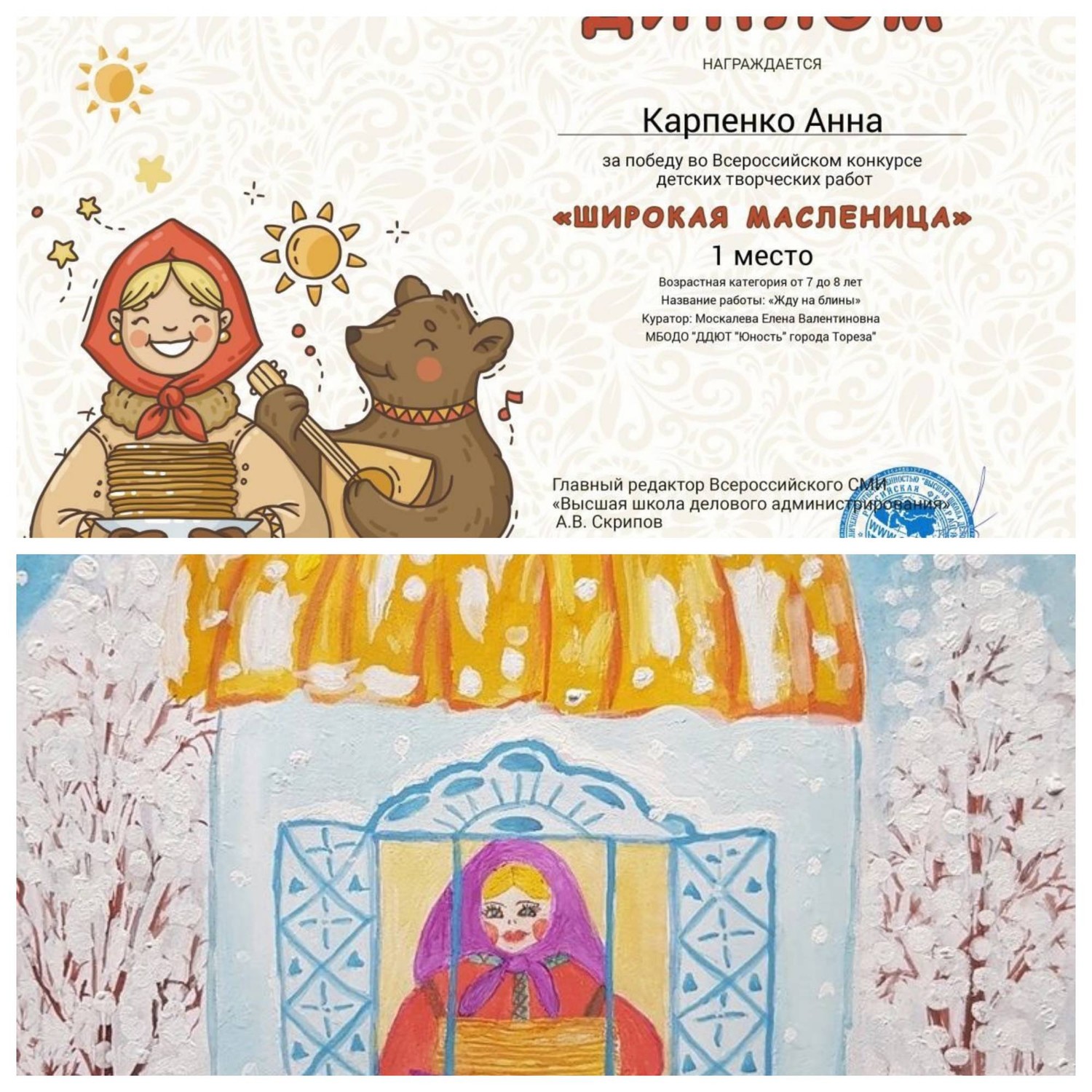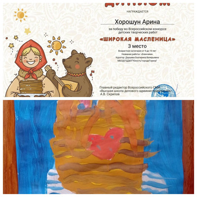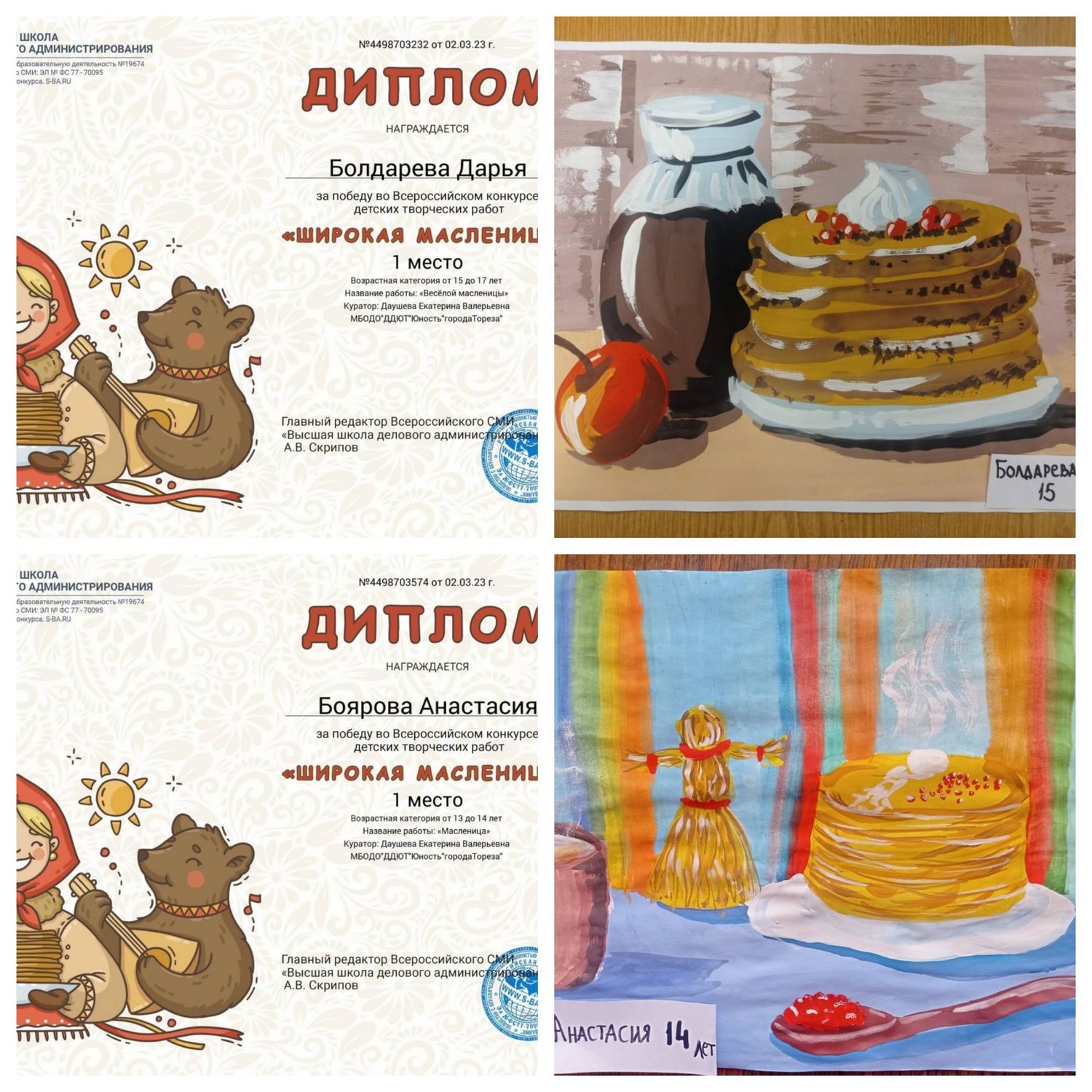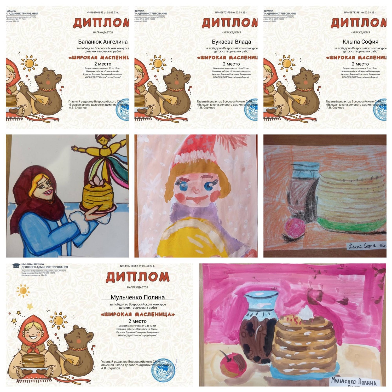 Широкая Масленица, мы тобою хвалимся, На горах катаемся, блинами объедаемся! Масленица - это последний зимний праздник. Заканчивается зима, начинается весна. Дни становятся длиннее и светлее, солнце светит ярче, и даже немного греет. Масленица - один из самых веселых праздников в году, который широко отмечается по всей России. Он отражает вековые традиции, бережно хранимые и передаваемые из поколения в поколение. Это недельный праздник-обряд с хороводами, песнями, плясками, играми, посвященный прощанию с зимой и встрече весны. Главная участница празднования - большая кукла, сделанная из соломы по имени Масленица. Всю Масленичную неделю пекут блины. С 25 февраля по 1 марта 2023 обучающиеся ТО МБОДО «ДДЮТ «Юность» приняли участие во Всероссийском конкурсе детских творческих работ «Широкая Масленица» от Высшей школы делового администрирования (г. Екатеринбург). Итоги конкурса - 3 первых, 6 вторых и 1 третье место. Народный художественный коллектив «Живопись и графика» (педагог Даушева Е.В.): 1-е места – Болдарева Дарья и Боярова Анастасия; 2-е места – Баланюк Ангелина, Букаева Влада, Клыпа София, Мульченко Полина; 3-е место – Хорошун Арина. Образцовый художественный коллектив «Школа красоты» (педагог Москалева Е.В.): 1-е место – Карпенко Анна; 2-е места – Печень Нелли и Кобрак Лидия. Педагоги награждены благодарственными письмами. Поздравляем и желаем дальнейшего творчества! | |
