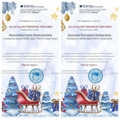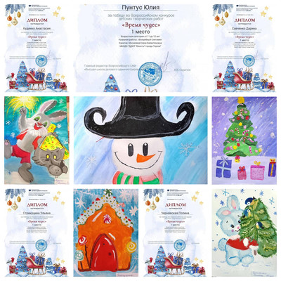 С 5 января по 11 января 2023 года обучающиеся творческих коллективов МБОДО «ДДЮТ «Юность» приняли участие во Всероссийском конкурсе детских творческих работ «Время чудес» (г. Екатеринбург). Основные задачи Конкурса: • Всестороннее содействие развитию детского творчества; • Предоставление участникам возможности в состязательной форме развить и продемонстрировать свои творческие способности. Цель Конкурса — развитие творческого мышления, фантазии и воображения; расширение кругозора детей. На конкурс принимались рисунки, аппликации и поделки, связанные с новогодней и рождественской тематикой. Для создания своих работ можно было использовать абсолютно всё, поэтому – обучающиеся включили свою фантазию и креативность! Итоги конкурса – 11 первых и 8 вторых места! Образцовый художественный коллектив «Школа красота» (педагог Москалева Е. В.) – 11 первых и 5 вторых места: 1-е места – Иким Виктория, Савченко Дарина, Гануляк Лев, Бутвина Алина, Карпенко Анна, Куденко Анастасия, Пунтус Юлия, Стрикуцина Ульяна, Чернявская Полина; 2-е места – Шукурова Нурай, Шукурова Айсу, Гануляк Ксения, Шеина Анастасия, Лидниченко Дарья. Народный художественный коллектив «Живопись и графика» (педагог Даушева Е.В.) – 2 первых и 3 вторых места: 1-е места – Терихова Таисия и Баланюк Ангелина; 2-е места – Красовская Ева, Коваленко Альбина и Мульченко Полина. Руководители награждены благодарственными письмами. Поздравляем с отличными результатами и желаем вдохновения! | |