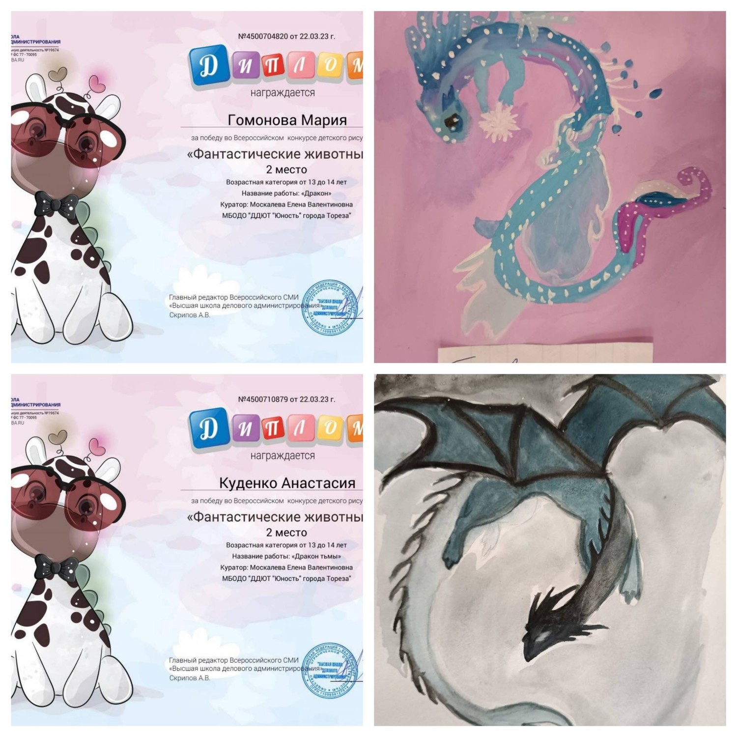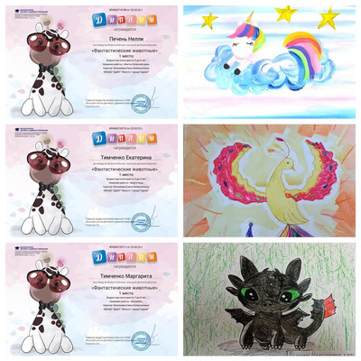 С 15 по 21 марта обучающиеся образцового художественного коллектива «Школа красоты» (педагог Москалева Е.В.) приняли участие во Всероссийском конкурсе детского рисунка «Фантастические животные» от Высшей школы делового администрирования (г. Екатеринбург). Все дети - мечтатели, фантазеры и выдумщики. Без фантазии не было бы развития ребенка. Воображение помогает детям рисовать, лепить, творить. Кто-то придумывает целые фантастические города, а кто-то забавных вымышленных животных. В мире фантазии и воображения ребенок может придумать для себя друга. Фантазии, это источник творчества, основанный на нестандартном мышлении. Детям было предложено нарисовать несуществующее воображаемое животное, раскрасить его яркими цветами. Итоги конкурса – 3 первых и 2 вторых места. 1-е места – Тимченко Маргарита, Тимченко Екатерина, Печень Нелли, 2-е места – Куденко Анастасия, Гомонова Мария. Педагог награждена благодарственным письмом. Поздравляем! | |