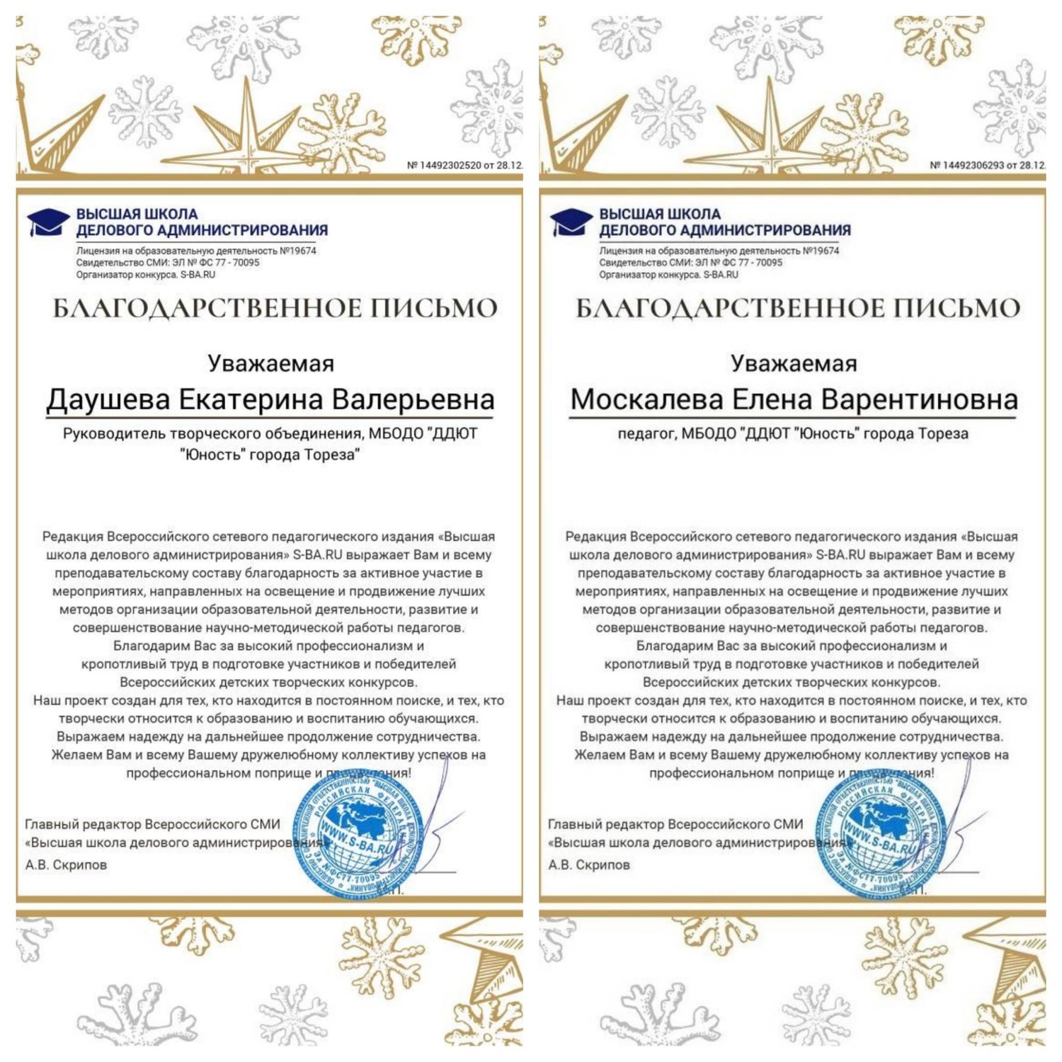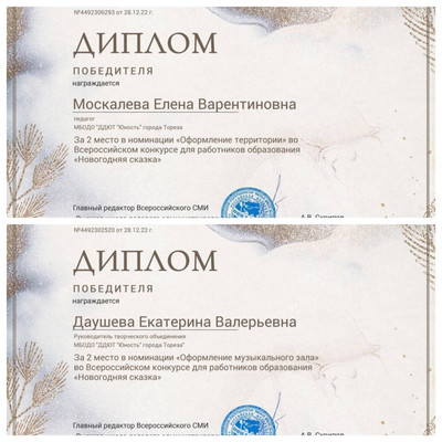 С 22 по 27 декабря педагоги Москалева Е.В. и Даушева Е.В. приняли участие во Всероссийском конкурсе для работников образования «Новогодняя сказка» от Высшей школы делового администрирования (г. Екатеринбург). Цель конкурса: развитие творческого потенциала работников образования по проектированию и эстетическому оформлению групп и кабинетов к Новому году. Задачи конкурса: ⎯ выявление лучшего опыта в оформлении групп и кабинетов к Новому году; ⎯создание благоприятных условий для воспитания эстетических, нравственных и культурных качеств обучающихся; ⎯ создания новогоднего настроения у сотрудников и обучающихся. Представленные на Конкурс материалы оценивались по следующим критериям: ⎯ творческий подход при создании и оформлении материалов, использование оригинальных форм и элементов исполнения. ⎯ оформление группы или кабинета в едином стиле. ⎯ украшения, сделанные своими руками, выполнены эстетично. По итогам конкурса педагоги заняли вторые места и награждены благодарственными письмами. Поздравляем! | |