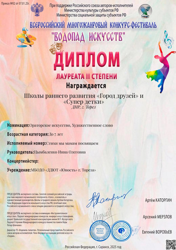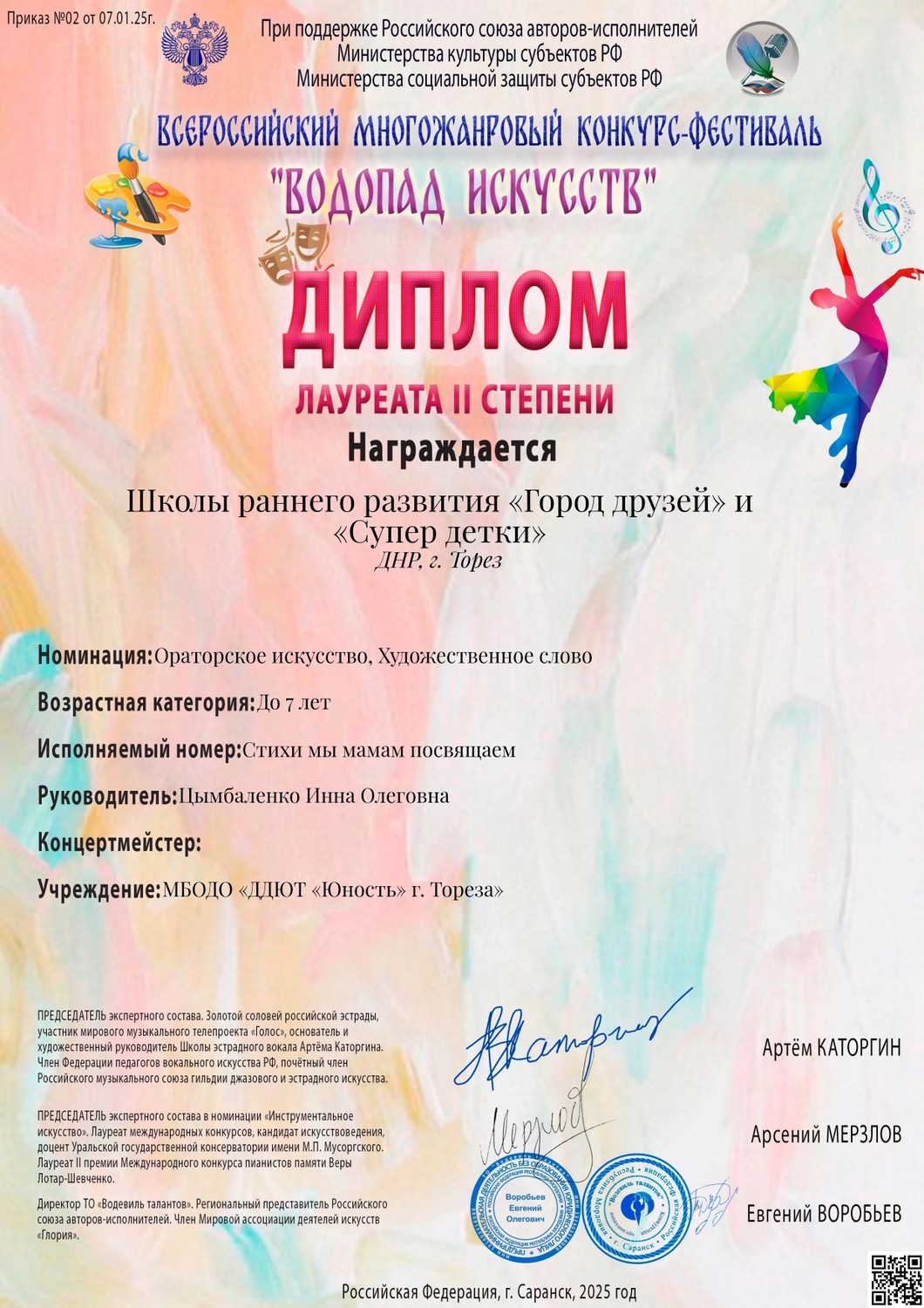В феврале воспитанники школ раннего развития «Город друзей» и «Супер детки» приняли участие во Всероссийском многожанровом конкурсе-фестивале «Водопад искусств» (номинация «Художественное слово»). Наши малыши стали лауреатами 2-ой степени! Поздравляем!