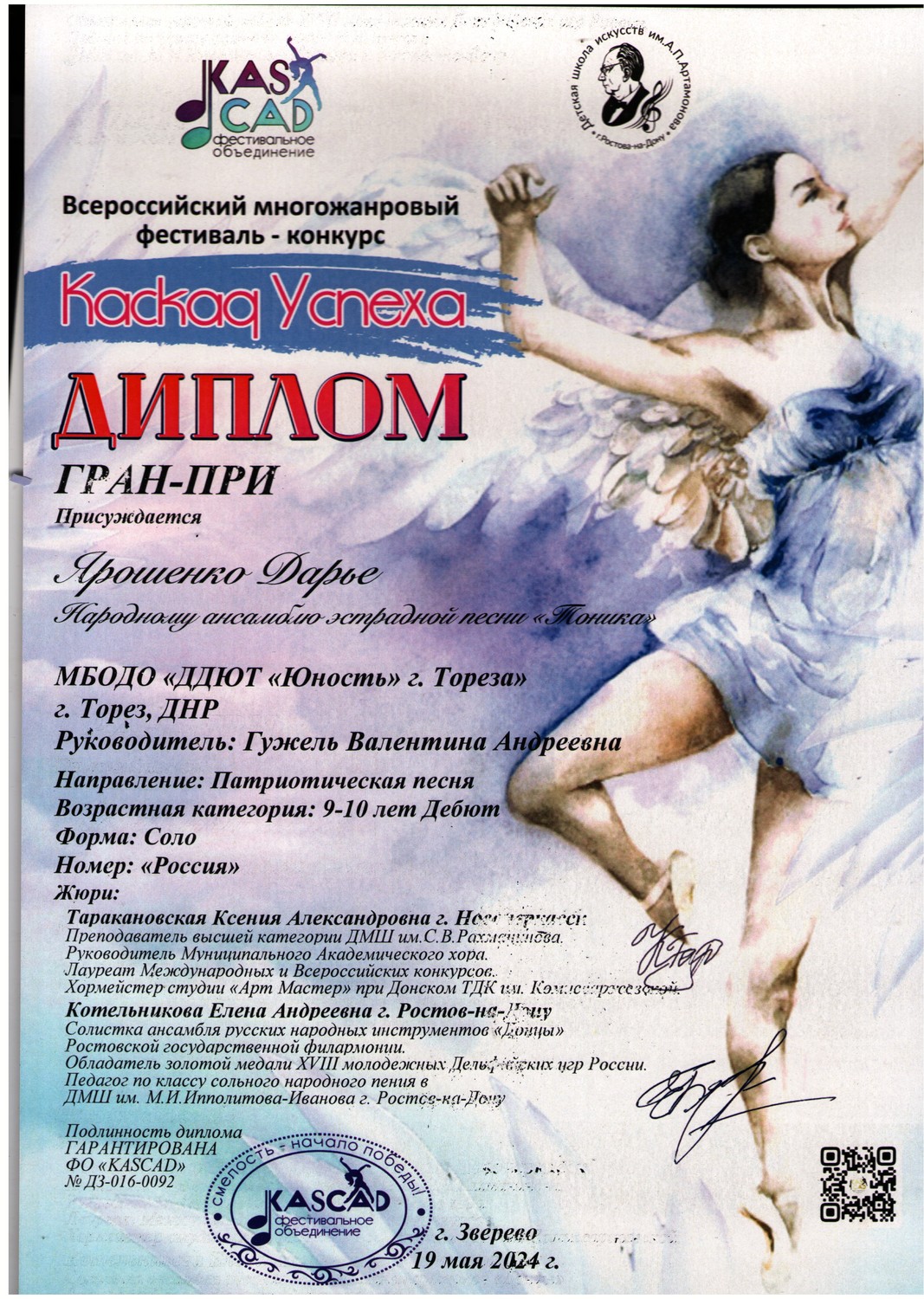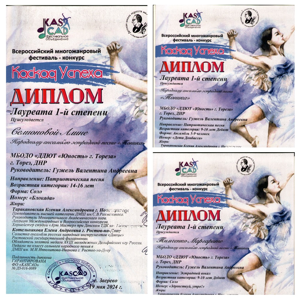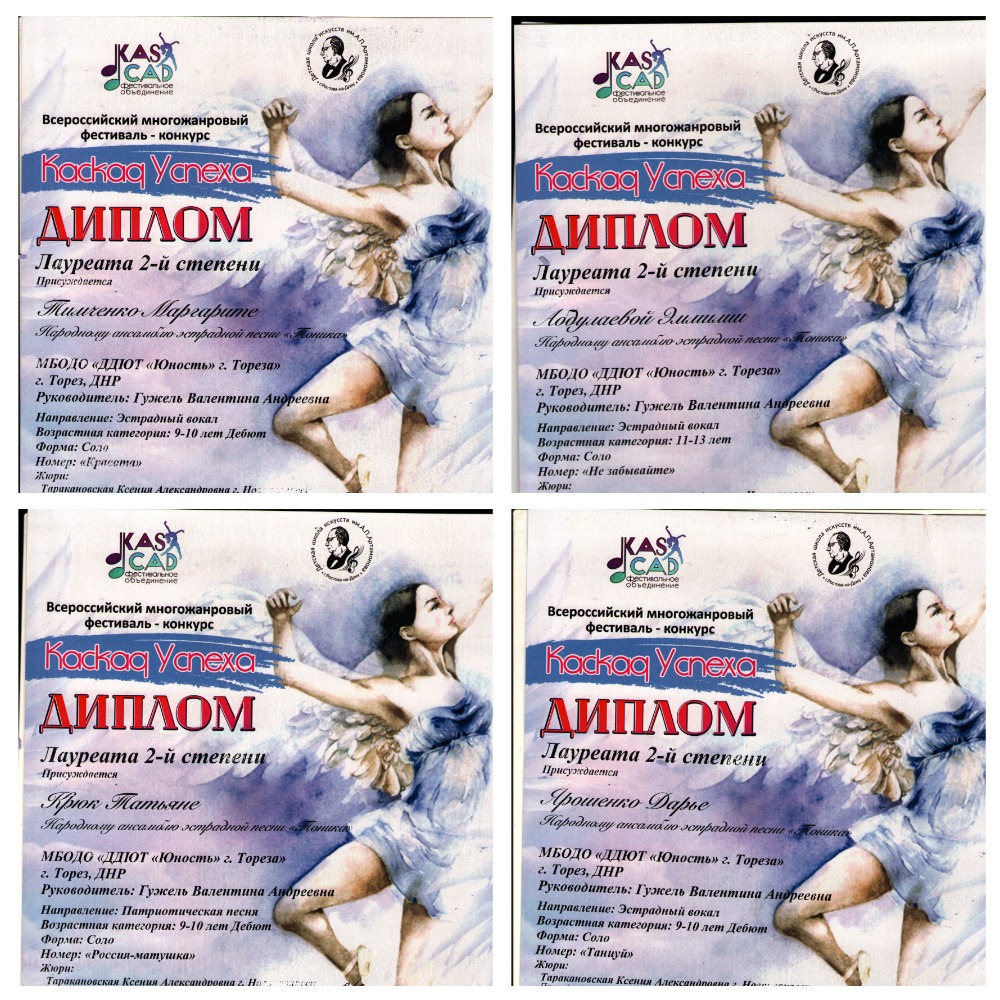 19 мая солисты народного ансамбля эстрадной песни «Тоника» (педагог Гужель В.А.) МБОДО «ДДЮТ «Юность» приняли участие в Всероссийском многожанровом конкурсе-фестивале «Каскад успеха» (г. Зверево). Организатор Фестивальное объединение «KASKAD». Фестиваль-конкурс проходил в муниципальном учреждении культуры социально-культурный центр «Маяк» г. Зверево, Ростовская область. В фестивале-конкурсе приняли участие солисты и хореографические коллективы из городов России, ЛНР и ДНР. Жюри конкурса высоко оценило талант наших юных вокалистов. В нелёгкой борьбе с сильными соперниками наши девчонки показали хорошие результаты. Итоги конкурса – Гран-при, 3 первых места, 4 вторых и 1 третье: Гран-при – Ярошенко Дарья («Россия»). Лауреаты 1-ой степени – младший ансамбль («Дети Донбасса), Селионова Алина «Блокада»), Тимченко Маргарита («Здравствуй, утро»). Лауреаты 2-ой степени – Крюк Татьяна («Россия-матушка»), Тимченко Маргарита (Красота»), Абдулаева Эммилия («Не забывайте»), Ярошенко Дарья («Танцуй»). Лауреат 3-ей степени – Крюк Татьяна («А может это счастье?»). Педагог награждена благодарственным письмом за отличную подготовку участников конкурса. Наши дорогие, самые талантливые, дружные и веселые дети, поздравляем вас с новой победой! Это ещё одна награда в копилку народного ансамбля «Тоника». Желаем не останавливаться на достигнутом и двигаться вперёд к новым вершинам! От души поздравляем с наградами! Молодцы! Так держать!