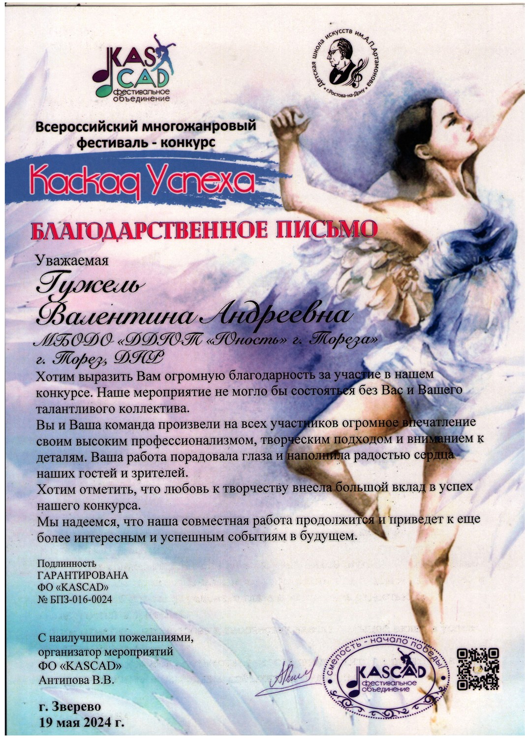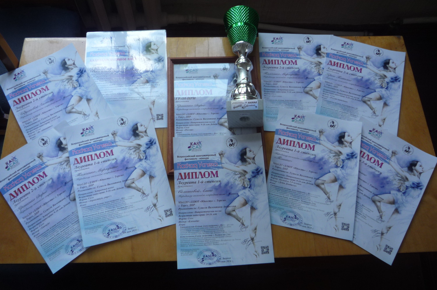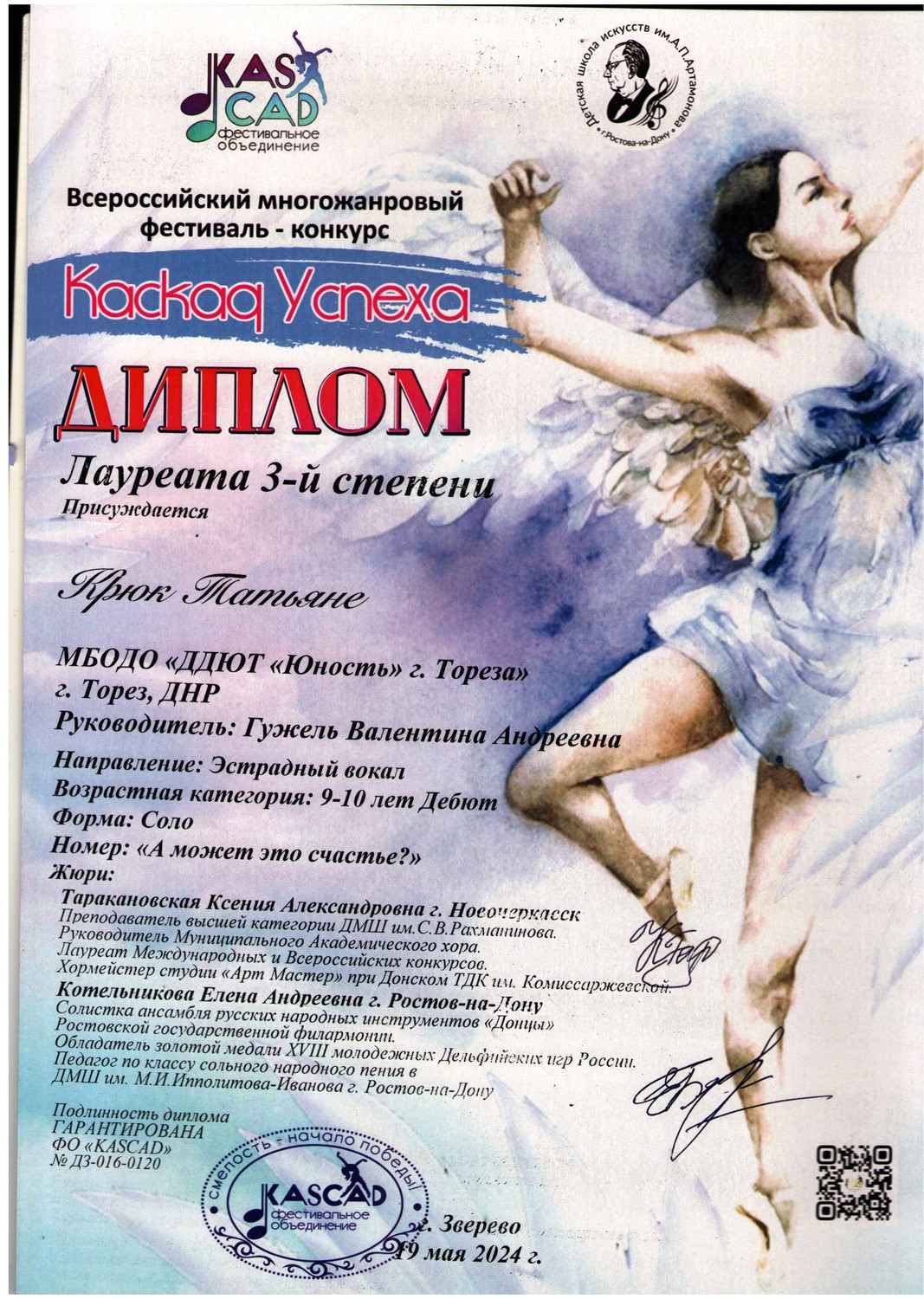19 мая солисты народного ансамбля эстрадной песни «Тоника» (педагог Гужель В.А.) МБОДО «ДДЮТ «Юность» приняли участие в Всероссийском многожанровом конкурсе-фестивале «Каскад успеха» (г. Зверево). Организатор Фестивальное объединение «KASKAD». Фестиваль-конкурс проходил в муниципальном учреждении культуры социально-культурный центр «Маяк» г. Зверево, Ростовская область. В фестивале-конкурсе приняли участие солисты и хореографические коллективы из городов России, ЛНР и ДНР. Жюри конкурса высоко оценило талант наших юных вокалистов. В нелёгкой борьбе с сильными соперниками наши девчонки показали хорошие результаты. Итоги конкурса – Гран-при, 3 первых места, 4 вторых и 1 третье: Гран-при – Ярошенко Дарья («Россия»). Лауреаты 1-ой степени – младший ансамбль («Дети Донбасса), Селионова Алина «Блокада»), Тимченко Маргарита («Здравствуй, утро»). Лауреаты 2-ой степени – Крюк Татьяна («Россия-матушка»), Тимченко Маргарита (Красота»), Абдулаева Эммилия («Не забывайте»), Ярошенко Дарья («Танцуй»). Лауреат 3-ей степени – Крюк Татьяна («А может это счастье?»). Педагог награждена благодарственным письмом за отличную подготовку участников конкурса. Наши дорогие, самые талантливые, дружные и веселые дети, поздравляем вас с новой победой! Это ещё одна награда в копилку народного ансамбля «Тоника». Желаем не останавливаться на достигнутом и двигаться вперёд к новым вершинам! От души поздравляем с наградами! Молодцы! Так держать!