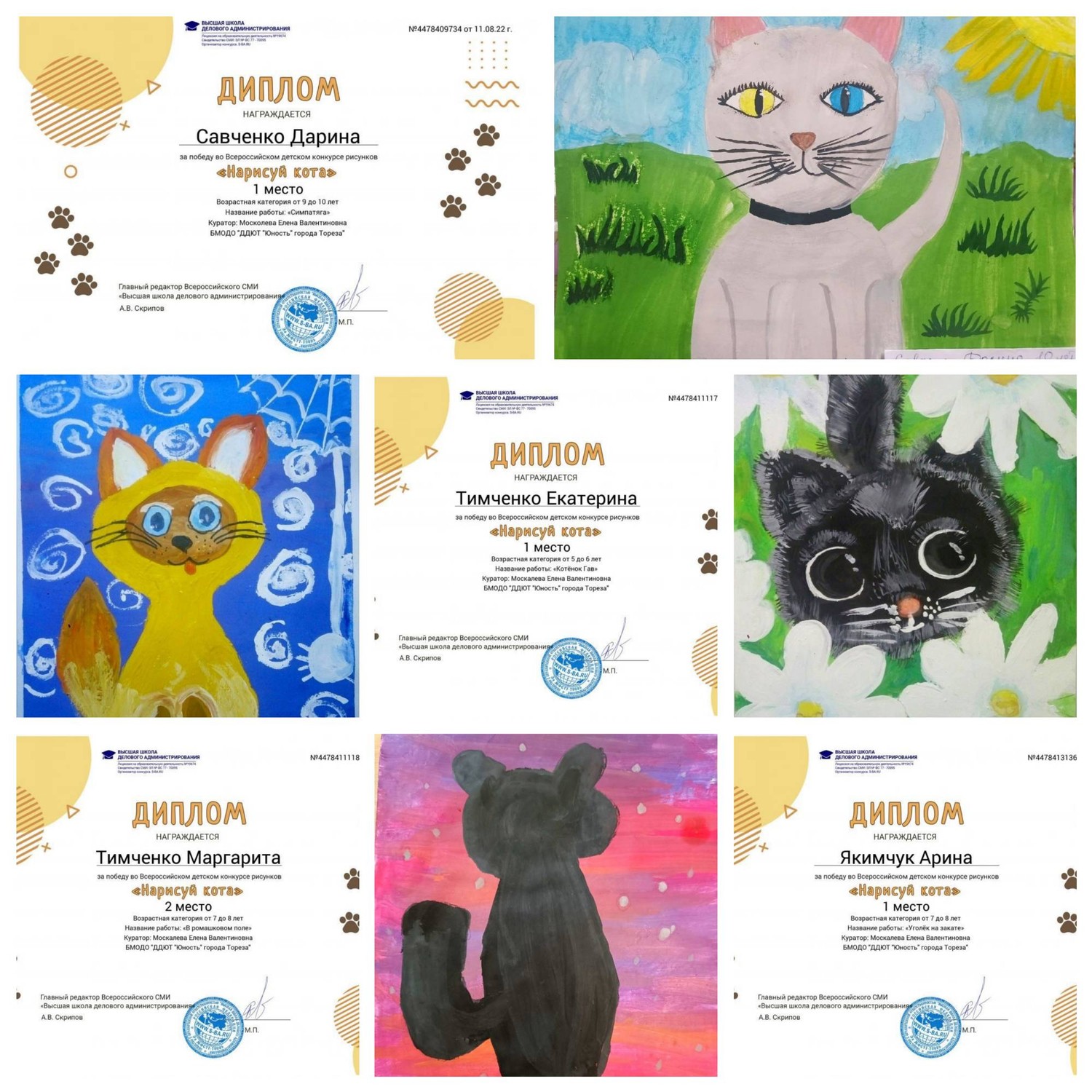 Всемирный день кошек отмечается ежегодно 8 августа, начиная с 2002 г., по инициативе Международного фонда по защите животных, не только с целью чествования пушистых питомцев, но и привлечения внимания к проблеме бездомных котов и кошек. Каким бы сложным ни был день, дома тебя встретит пушистый кот, и он всегда сможет поднять тебе настроение, стоит только протянуть руку. Кошки очень игривые животные, всегда рады вниманию. Также они отличные охотники, у них быстрая реакция и острые когти. В нашей стране кошки даже работают в музеях, они охраняют музейные ценности от грызунов. С 05 по 10 августа обучающиеся образцового художественного коллектива «Школа красоты» (педагог Москалева Е.В.) и народного художественного коллектива «Живопись и графика» (педагог Даушева Е.В.) МБОДО «ДДЮТ «Юность» приняли участие во Всероссийском детском конкурсе рисунков «Нарисуй кота» от Высшей школы делового администрирования. Основные цели Конкурса: • активизировать познавательную деятельность детей; • создания условий для развития творческого потенциала детей; • формирование любви к братьям нашим меньшим – кошкам. Итоги конкурса: 8 первых и 2 вторых места! Образцовый художественный коллектив «Школа красоты» (педагог Москалева Е.В.): 1-е места – Лидниченко Дарья, Бояринцева Анастасия, Куденко Анастасия, Диденко Назар, Тимченко Екатерина, Савченко Дарина, Якимчук Арина; 2-е места – Иким Виктория и Тимченко Маргарита. Народный художественный коллектив «Живопись и графика» (педагог Даушева Е.В.): 1-е место – Агеева Алия. Руководители награждены благодарственными письмами. Поздравляем с отличными результатами! | |
