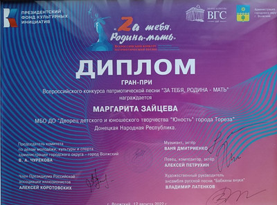 В июле солисты народного ансамбля эстрадной песни «Тоника» (педагог Гужель В.А.) приняли участие во Всероссийском конкурсе патриотической песни «За тебя, Родина-мать». Патриотический фестиваль стал идеей коллектива ДК «ВГО», проект выиграл грант Президентского фонда культурных инициатив на 4 миллиона рублей. Соорганизатором фестиваля выступил комитет по делам молодёжи, культуре и спорту администрации Волжского. Всего на конкурс было подано более 1000 заявок со всей России и Донбасса. Конкурсное жюри отобрало 100 лучших исполнителей, среди которых были и наши звёздочки: Казанцева Дарья, Селионова Алина, Гайворонская Александра и Зайцева Маргарита. По результатам онлайн-голосования были отобраны 17 лауреатов, которые приняли участие в заключительном Гала-концерте в г. Волжский вместе с приглашёнными звёздами эстрады: группы «Бабкины внуки», «Губерния», Алексей Петрухин и Ваня Дмитриенко. https://fast.vk.com/feed?z=video279222949_456239077%2Fa0108a1bec31a55002%2Fpl_post_279222949_95 Итоги конкурса: Гран-при – Зайцева Маргарита, 1-е место – Гайворонская Александра. Участницам были вручены памятные подарки и дипломы. Поздравляем с победой и желаем дальнейших успехов! | |