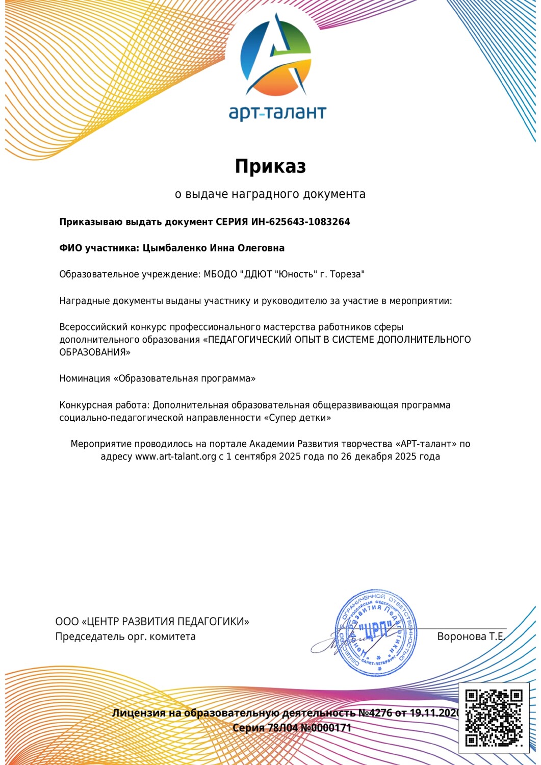 Педагог Дворца творчества Цымбаленко И.О. приняла участие во Всероссийском конкурсе профессионального мастерства работников сферы дополнительного образования «Педагогический опыт в системе дополнительного образования» (платформа «Арт-талант», г. Санкт-Петербург) и стала победителем конкурса (номинация «Образовательная программа»).