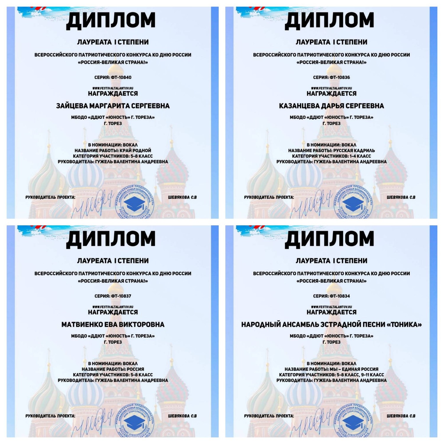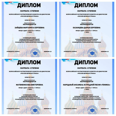 Результаты конкурса – 8 лауреатов 1-ой степени! Это солисты – Ярошенко Дарья, Селионова Алина, Зайцева Маргарита, Рымар Мария, Казанцева Дарья, Матвиенко Ева и ансамбль с композициями «Мы-единая Россия» и «Песня о Родине». Руководитель награждена благодарственным письмом. Поздравляем и желаем творческих успехов! | |