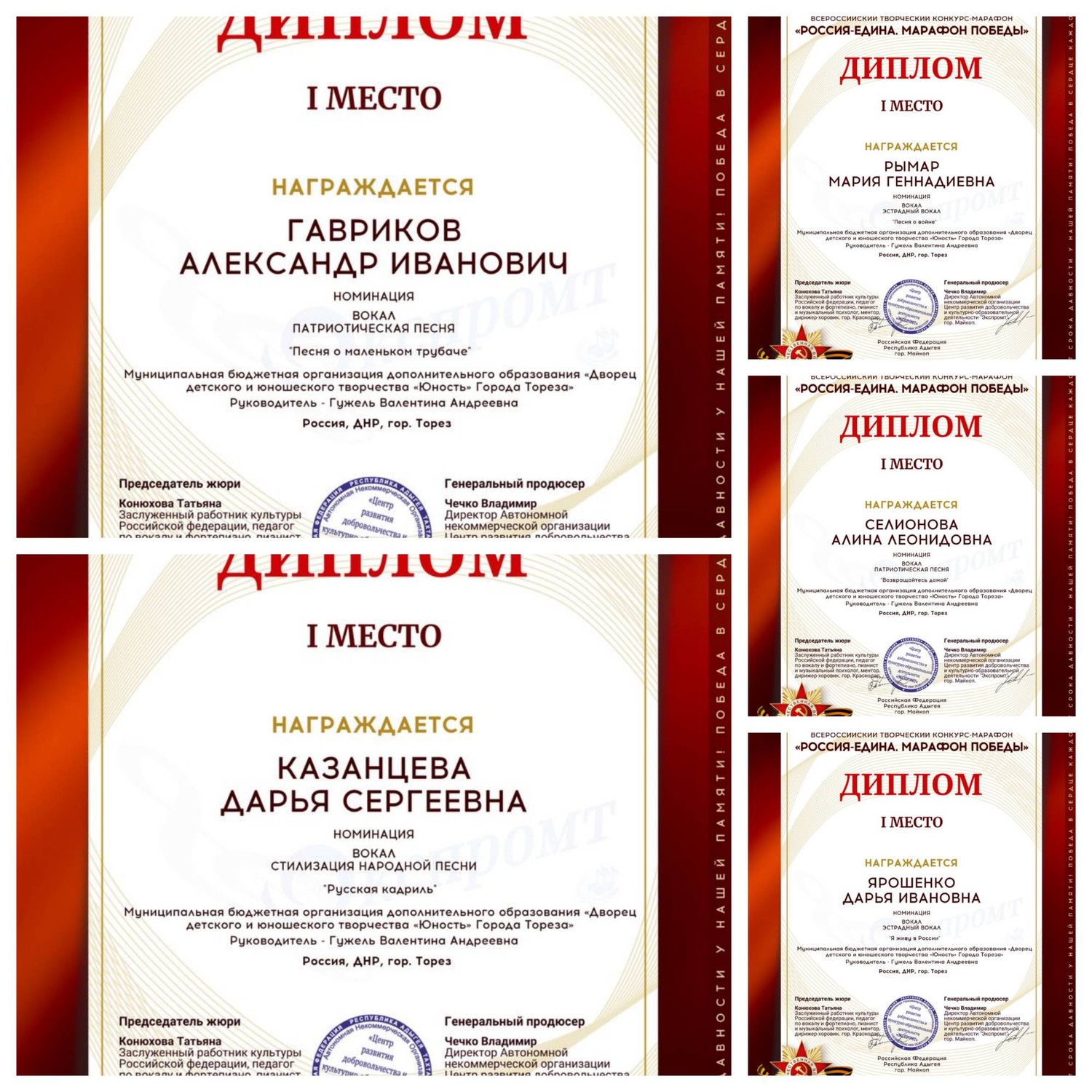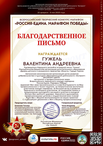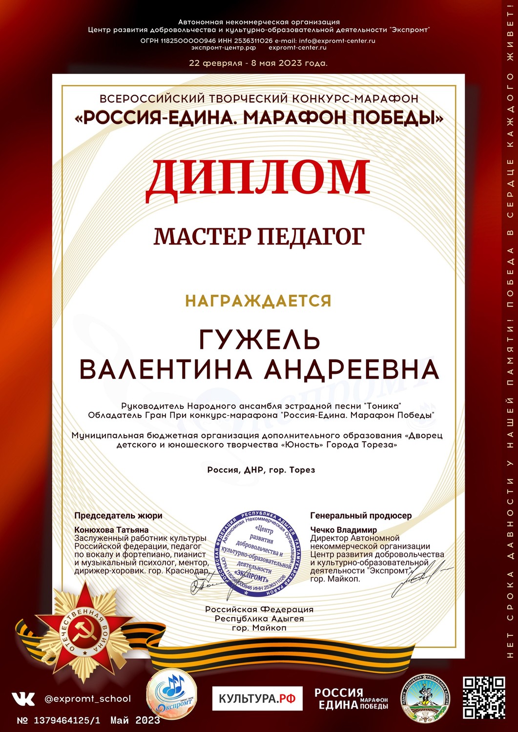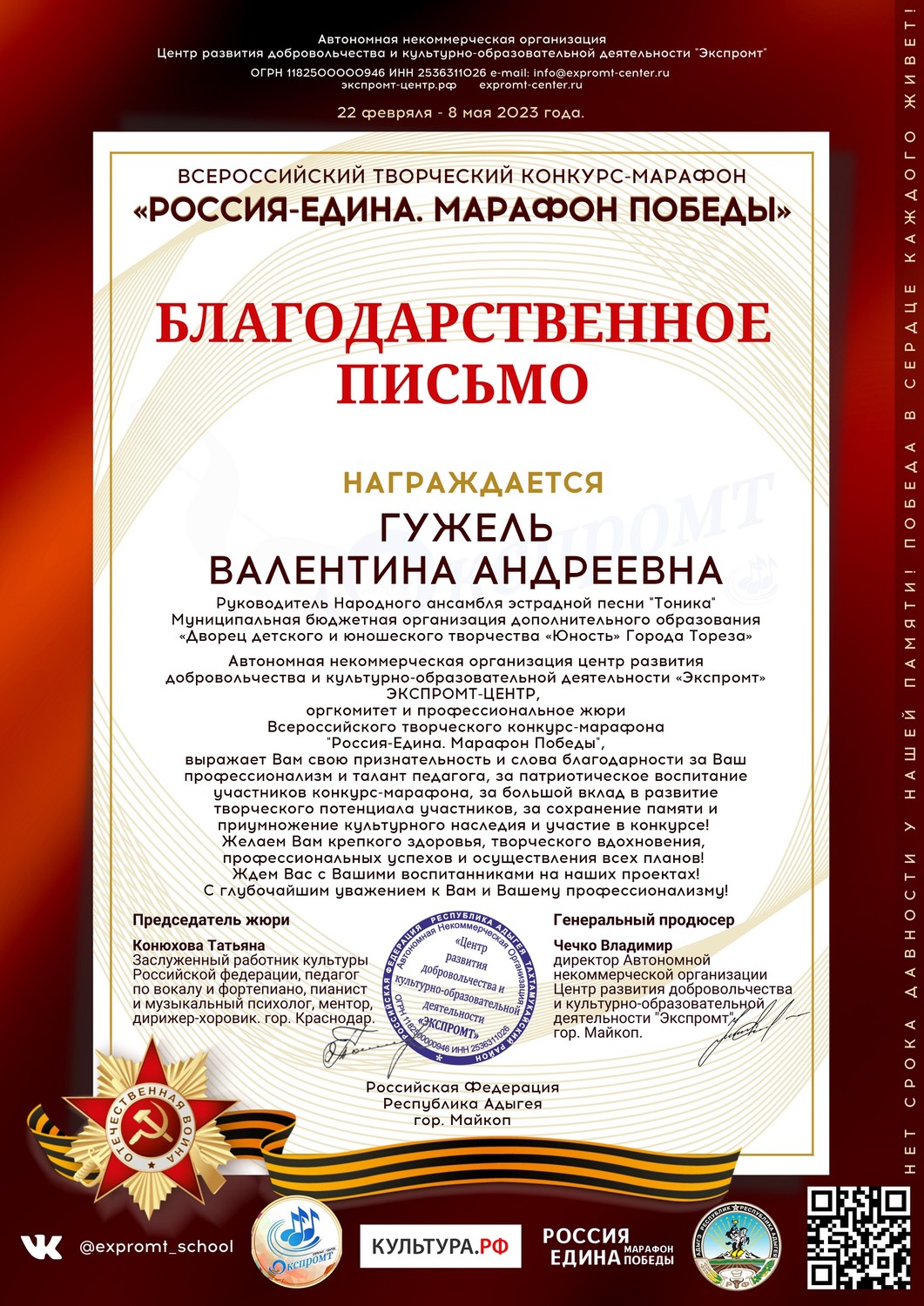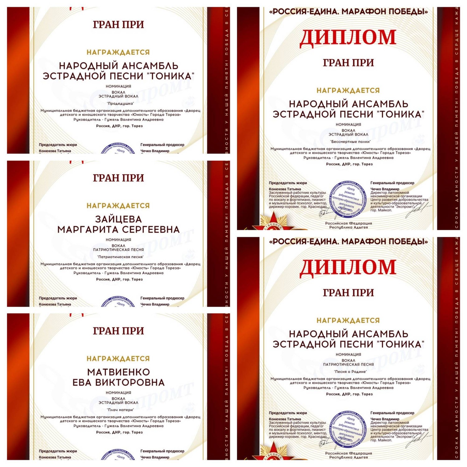 С 22 февраля по 8 мая 2023 года народный ансамбль эстрадной песни «Тоника» 9педагог Гужель В.А.) принял участие во Всероссийском творческом конкурсе-марафоне «Россия-Едина. Марафон Победы» от "Экспромт-Центр" (Республика Адыгея, г. Майкоп»). При информационной поддержке КУЛЬТУРА.РФ и Министерства культуры Российской Федерации. Результаты конкурса – 5 гран-при и 5 первых мест! Гран-при – Матвиенко Ева, Зайцева Маргарита, песня «Прадедушка» (младшая группа), «Песня о Родине» и «Бессмертные полки» (средняя и старшая группы); 1-е места – Рымар Мария, Селионова Алина, Гавриков Александр, Казанцева Дарья и Ярошенко Дарья. Валентина Андреевна награждена благодарностью и дипломом «Мастер-педагог». Поздравляем наш замечательный коллектив с отличными результатами и желаем творчества и вдохновения!