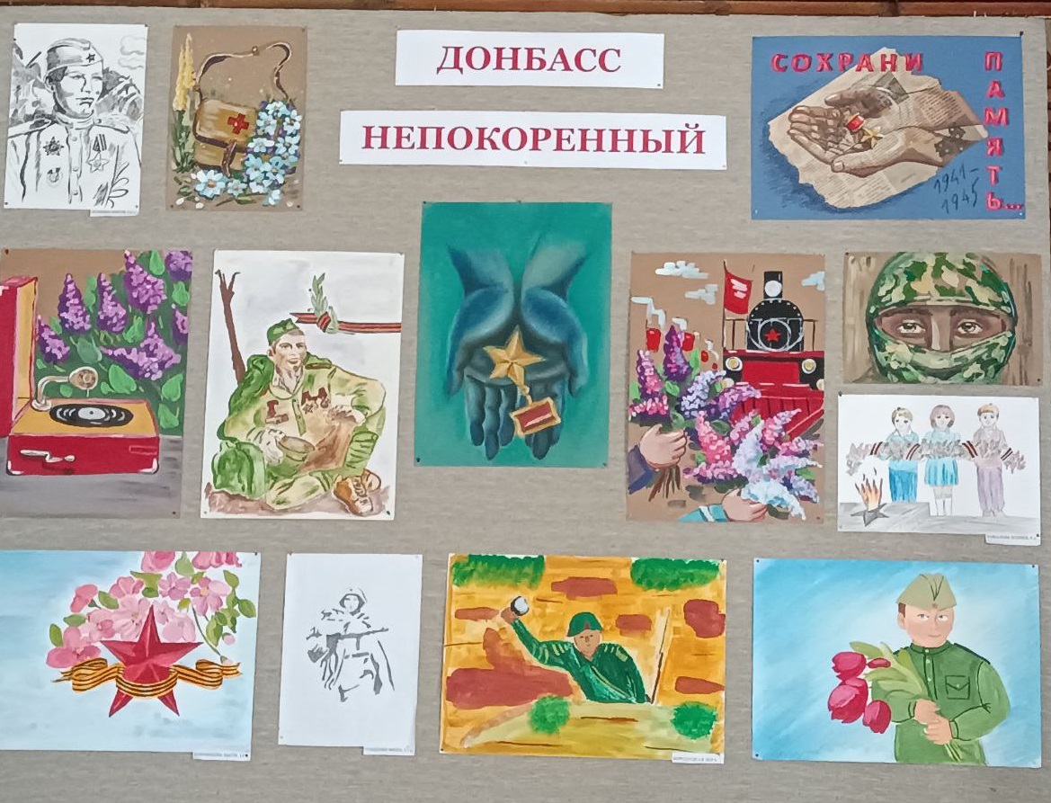 В фойе Дворца творчества «Юность» представлена выставка рисунков «Донбасс непокорённый», приуроченная к 82-ой годовщине освобождения Тореза и Донбасса от немецко-фашистских захватчиков. Работы выполнены обучающимися образцового художественного коллектива «Школа красоты» (педагог Москалева Е.В.). Все участники проявили творческую фантазию, оригинальность. В начале Великой Отечественной Войны захват территории Донбасса был приоритетным для солдат Вермахта. Уже в начале сентября 1941 года за Донбасс велись ожесточенные бои. Полная оккупация наступила с приходом в Сталино немецких и итальянских войск 20 октября 1941 года. Гитлеровцы установили жесткий режим, однако покорить народ Донбасса им не удалось. Военная жандармерия совместно с полицаями беспощадно истребляла местное население и попавших в плен красноармейцев. Более 700 дней длилась оккупация, ознаменованная колоссальным сопротивлением дончан. 8 сентября 1943 года наступил один из самых радостных дней – силами 5-ой ударной армии был освобожден город Сталино. По поводу крупной победы на Донбассе Москва в 20.00 салютовала нашим доблестным воинам – освободителям двадцатью артиллерийскими залпами из двухсот двадцати четырех орудий. Человечество в неоплатном долгу перед теми миллионами людей, которые погибли, защищая родину от порабощения, неволи, фашизма, грозившего уничтожить все славянские народы.