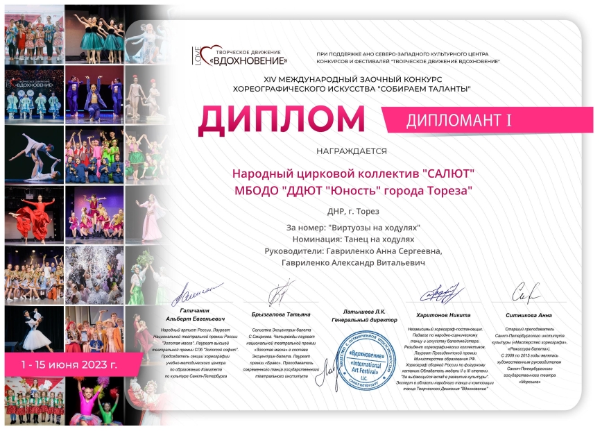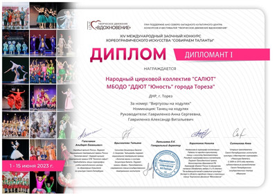 С 1 по 15 июня народный цирковой коллектив «Салют» (педагоги Анна и Александр Гавриленко) принял участие в XIV Международном заочном конкурсе хореографического искусства «Собираем таланты» от Творческого движения «Вдохновение». За номер «Виртуозы на ходулях» (номинация «Танцы на ходулях») обучающиеся стали дипломантами 1-ой степени! Поздравляем и желаем успехов в творчестве! | |