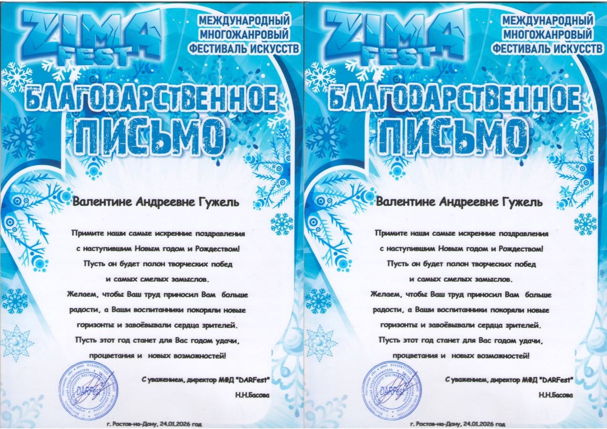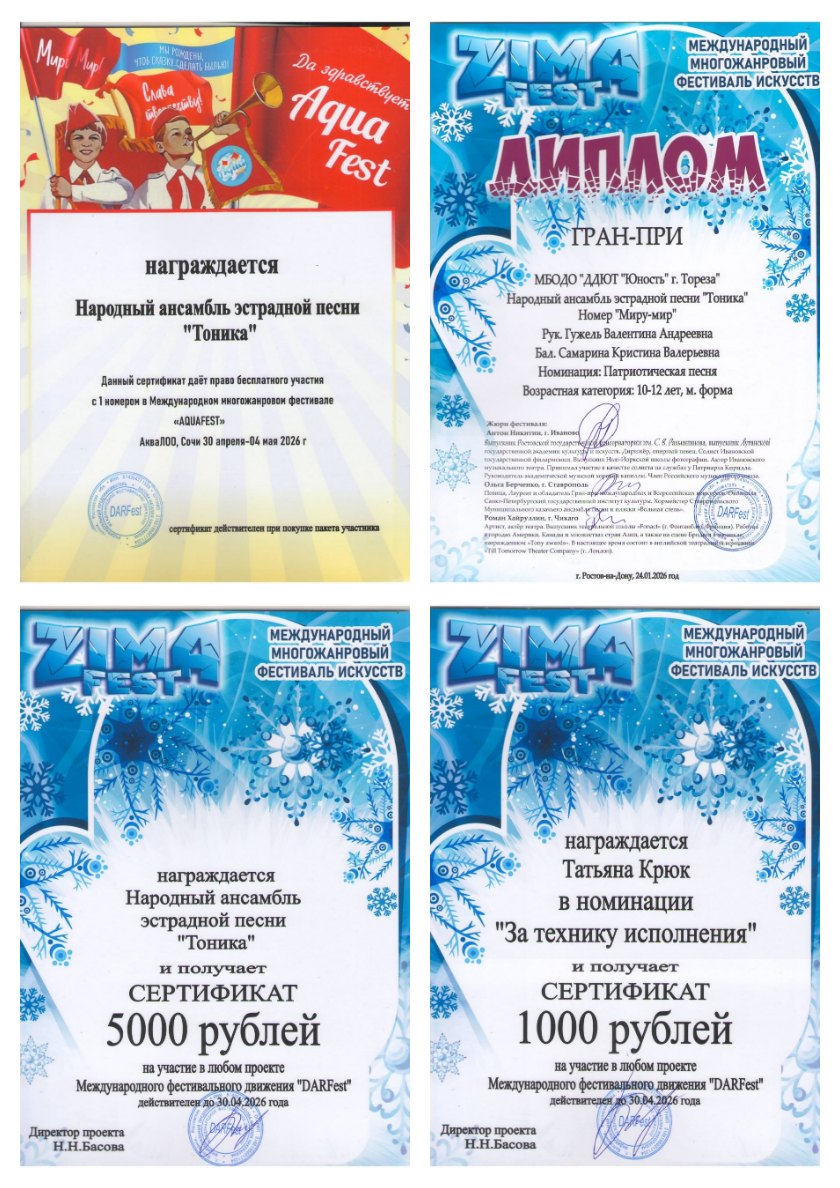 24 января 2026 г. солисты народного ансамбля эстрадной песни «Тоника» (педагог Гужель В.А.) МБОДО «ДДЮТ «Юность» приняли участие в XV Международном многожанровом фестивале искусств «ZIMAfest» (г. Ростов-на-Дону). Итоги конкурса – 1 Гран-при, 9 первых мест и 2 вторых! Гран-при – младшая группа ансамбля («Миру-мир»), Лауреаты 1 степени – Тимченко Екатерина («Когда мне будет 21», «Праздник»), Тимченко Маргарита («Ты Россия моя», «Кусочки»), Ярошенко Дарья («Белая птица»), Крюк Татьяна («О планете голубой», «Берёзы»), Тюпа Анна («Россия», «Звучит Россия»), Лауреат 2 степени – Ярошенко Дарья («Русская матрёшка»), Мироненко Татьяна («Первый шаг»). Ансамбль награждён сертификатом на исполнение одного номера в следующем конкурсе, а солистка Крюк Татьяна награждена специальным призом за технику исполнения. Педагоги награждены благодарственными письмами. Молодцы! Мы вами гордимся! | |