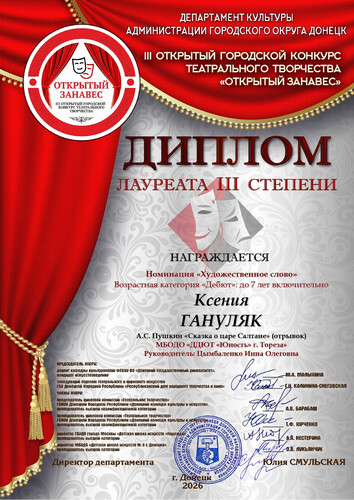Гануляк Ксения приняла участие в III Открытом городском конкурсе театрального творчества «Открытый занавес» и стала лауреатом 3-ей степени!