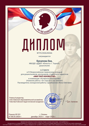 Москалева Е.В, стала победителем Всероссийского конкурса педагогического мастерства «Зимний калейдоскоп» (номинация «Методическая разработка»), платформа «Арт-талант». ... Читать дальше »