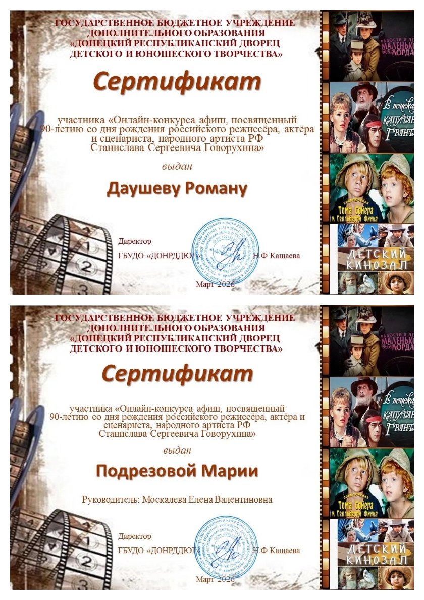 Даушев Роман, обучающийся ТО «Живопись и графика», и Подрезова Мария, обучающаяся ТО «Школа красоты» (педагог Москалева Е.В.) получили сертификаты участников «Онлайн-конкурса афиш, посвящённый 90-летию со дня рождения российского режиссёра, актёр и сценариста, народного артиста РФ Станислава Сергеевича Говорухина». ... Читать дальше »