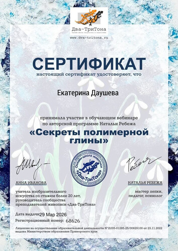 Педагог Дворца творчества Даушева Е.В. приняла участие в обучающем вебинаре по авторской программе Натальи Ребежа «Секреты полимерной глины» на платформе «Два-ТриТона».
