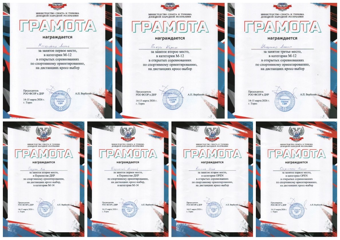 14.03-15.03.2026 в г.о. Торез прошел Региональный Чемпионат ДНР по спортивному ориентированию на дистанциях кросс-выбор многодневный, в котором приняли участие обучающиеся клуба «Пешеходный туризм» (педагог Короткая А.В.) МБОДО «ДДЮТ «Юность» г. Тореза». Мероприятие состоялось в соответствии с планом Федерации Спортивного Ориентирования России. В Чемпионате приняли участие 63 спортсмена из городов: Донецка, Макеевки, Луганска, Тореза Соревнования предусматривали прохождение дистанции на местности со сложным рельефом и растительным покровом. Участникам предстояло самостоятельно выбрать маршрут, по которому они будут двигаться и продумать какое количество контрольных пунктов необходимо будет взять. Эта задача создавала дополнительные сложности и требовала, кроме навыков ориентирования, умения быстро принимать решения и адаптироваться к изменяющимся условиям. Не всем юным ориентировщикам удалось справиться с заданием, но тем ценнее призовые места, которые получили они в разных возрастных категориях. Итоги Чемпионата: OPEN 1 место Охрименко Полина 2 место Климов Илья М-12 1 место Матвиенко Денис 2 место Павук Кирилл 3 место Шищенко Даниил М-14 1 место Бережной Николай 2 место Гануляк Лев Поздравляем! Молодцы! | |