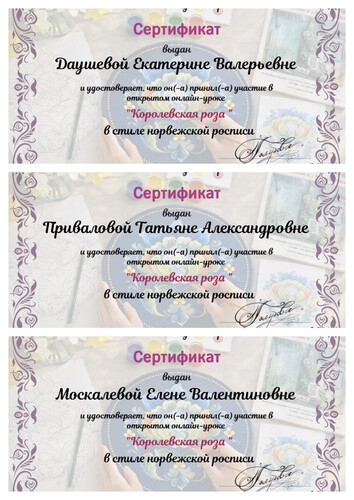 Педагоги Дворца творчества Даушева Е.В., Привалова Т.А. и Москалева Е.В получили сертификат за участие в открытом онлайн-уроке «Королевская роза» в стиле норвежской росписи от онлайн-школы «Русская роспись».