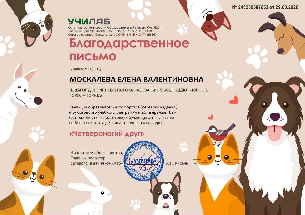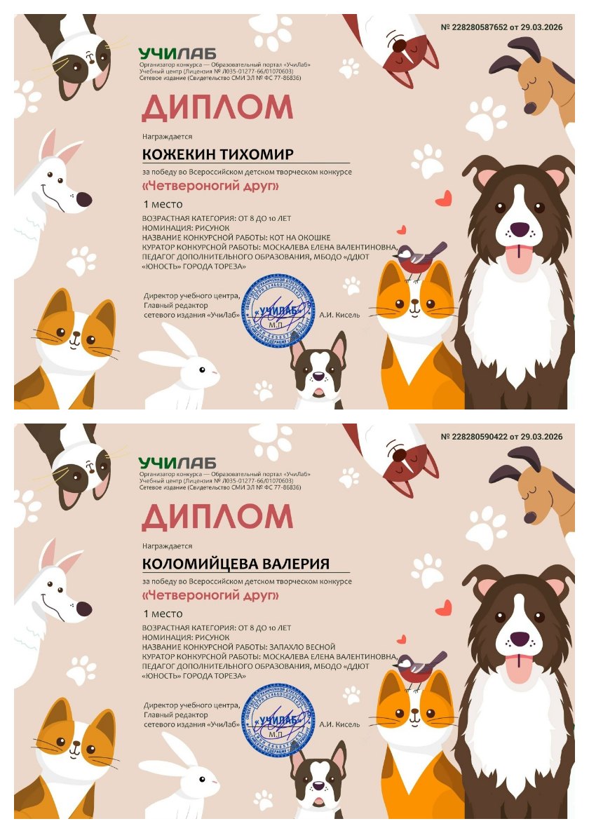 Обучающиеся образцового художественного коллектива «Школа красоты» (педагог Москалева Е.В.) приняли участие во Всероссийском детском творческом конкурсе «Четвероногие друзья» (платформа Училаб»). Итоги конкурса – 2 первых места: 1 место – Кожекин Тихомир, Коломийцева Валерия. Педагог награждена благодарственным письмом. Молодцы! | |