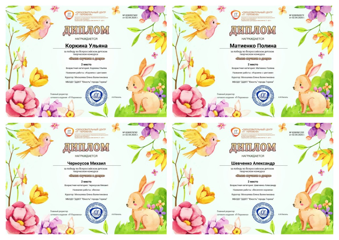 Обучающиеся образцового художественного коллектива «Школа красоты» (педагог Москалева Е.В.) приняли участие во Всероссийском детском творческом конкурсе «Весна стучится в двери» (платформа «ИТ-Перемена»). Итоги конкурса – 9 первых и 4 вторых места! 1 место – Аверкина Лина, Гридина София, Гурова Лилия, Ивашина Полина, Саморядова Мария, Починко Ярослава, Подрезова Мария, Крушельницкая Кира. 2 место - Шевченко Александр, Черноусов Мизаил, Матиенко Полина, Коркина Ульяна. Педагог награждена благодарственным письмом. Мы вами гордимся!
